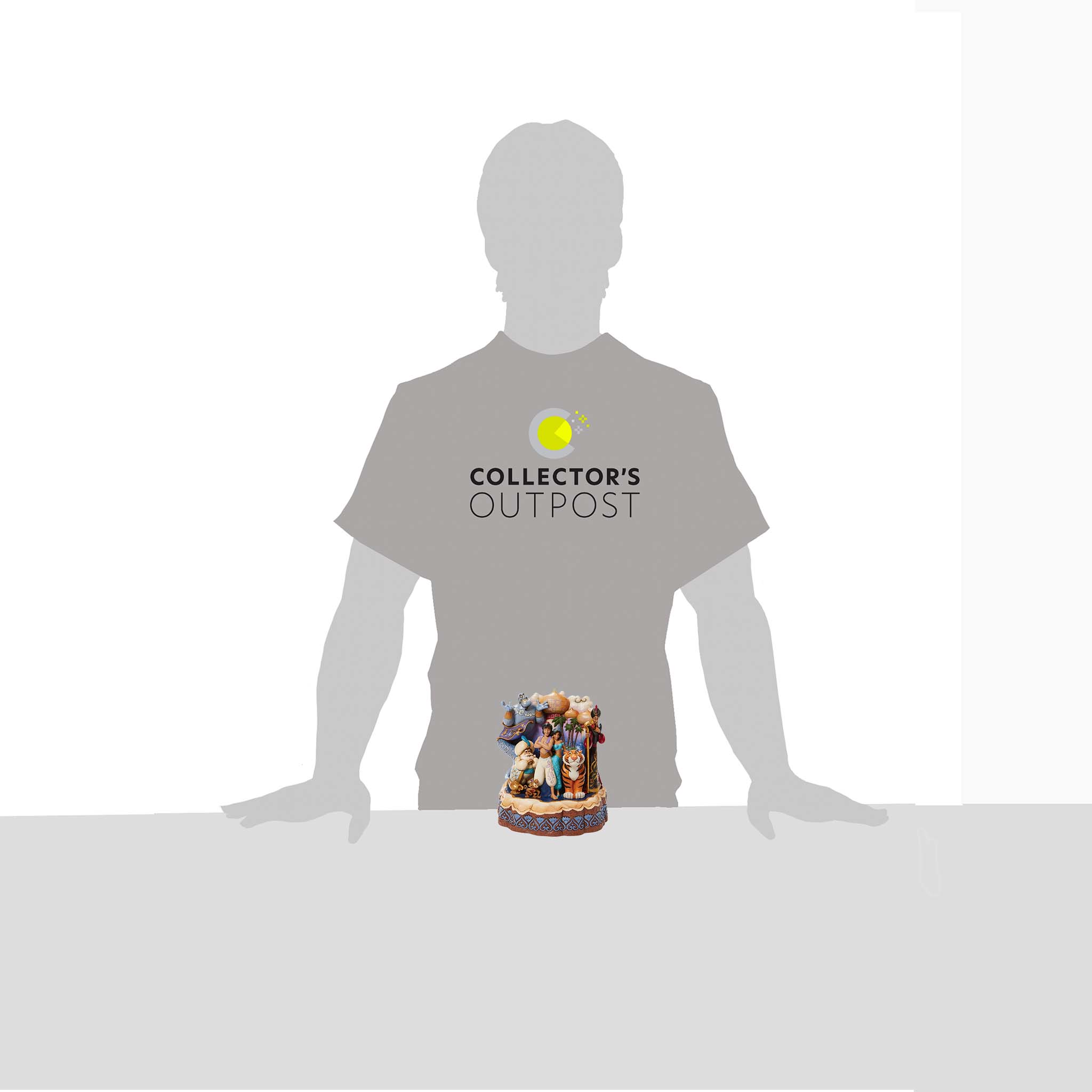 The gangs all here in this marvelous Aladdin figurine by Jim Shore. Aladdin and Jasmine take center stage as Abu, Rajah, and the Sultan smile close by. The magic carpet, lamp, Genie, and Jafar peer pointedly from the breathtaking Arabian city.